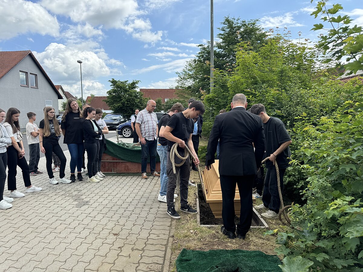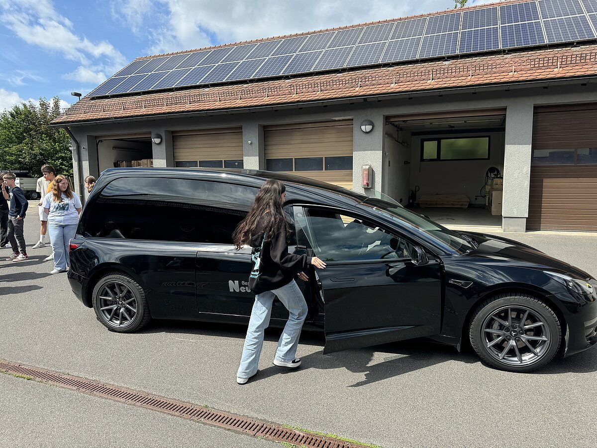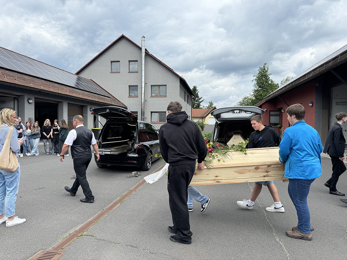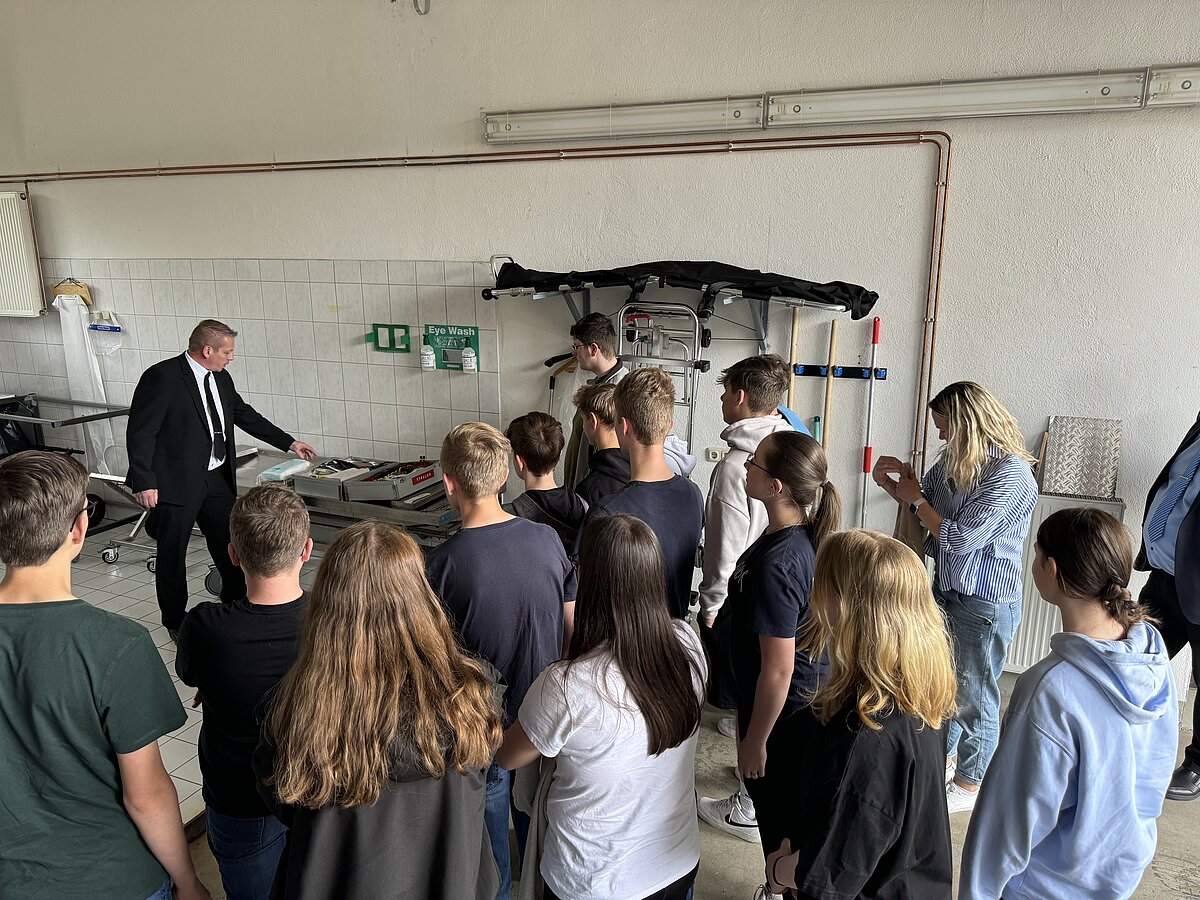 Ein besonderes Highlight war das Lager, wo den Schülern das Vorbereiten des Sarges bei den verschiedenen Führungen abwechselnd von unseren Mitarbeitern Herrn Schäfer, Herrn Ittner, Herrn Inac und Herrn Trampert gezeigt wurde. Anschließend durften sie selbst Hand anlegen. Im Versorgungsraum erklärte Herr Brehmer den Schülern, wie Verstorbene gewaschen und bekleidet werden. Anschließend dekorierten die Schüler eine Urnenbeisetzung. Der Florist lieferte Blumen, und eine Urne wurde in einer beispielhaften Trauerzeremonie beigesetzt. Die Schüler durften auch das Urnengrab öffnen und eine beispielhafte Erdbestattung durchführen. Einige Schüler hatten zudem die Gelegenheit, als Beifahrer im Tesla-Bestattungswagen einen Sarg zu einer beispielhaften Beerdigung zu begleiten.