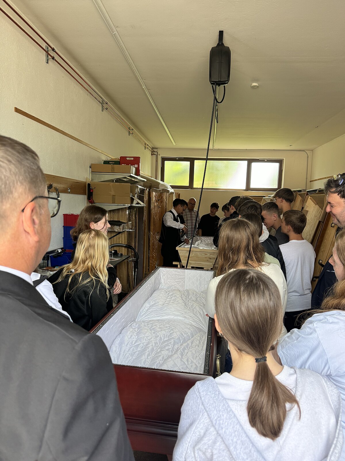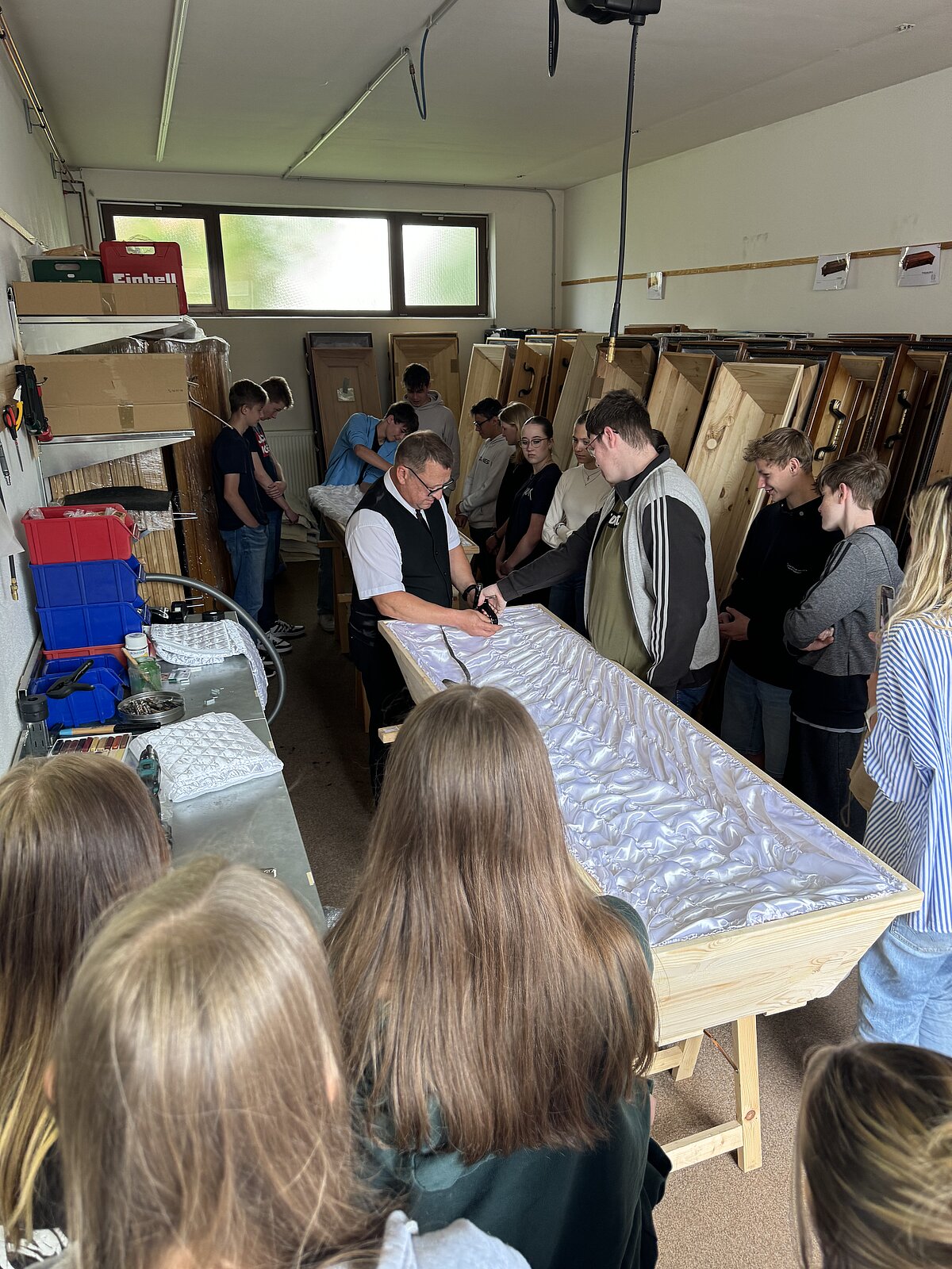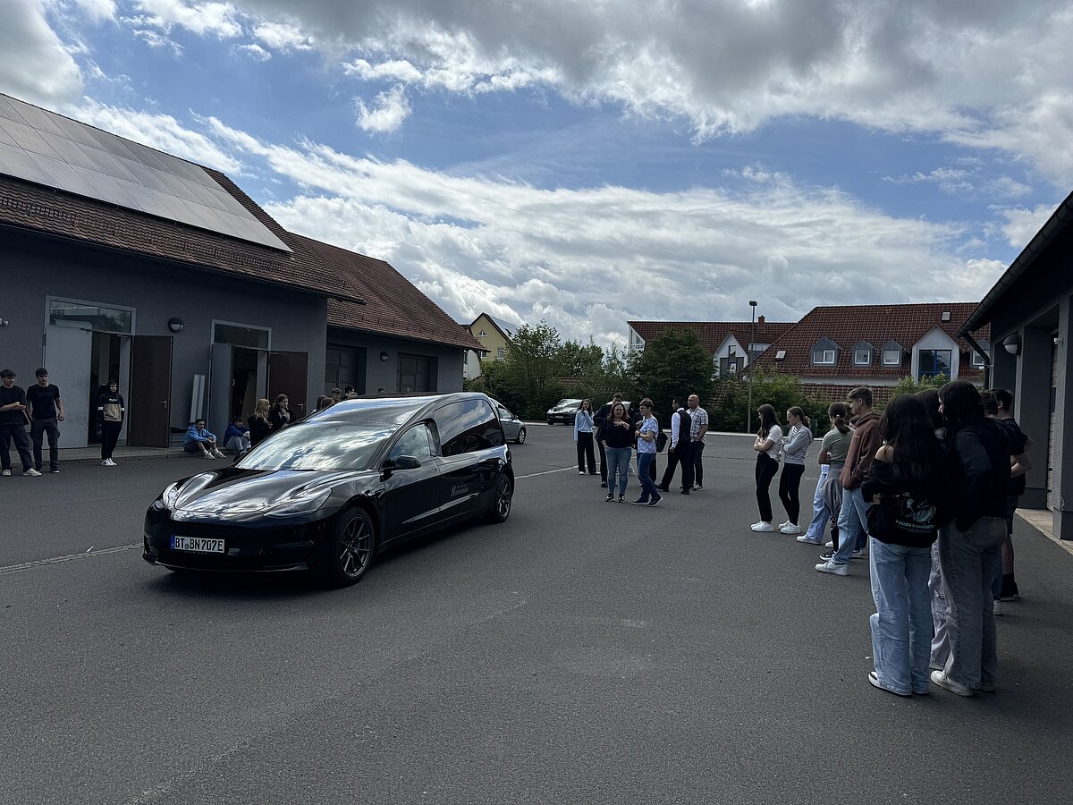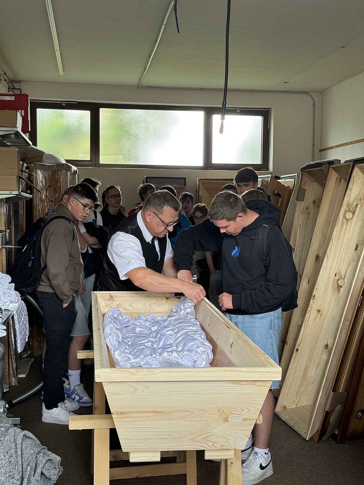 Ein besonderes Highlight war das Lager, wo den Schülern das Vorbereiten des Sarges bei den verschiedenen Führungen abwechselnd von unseren Mitarbeitern Herrn Schäfer, Herrn Ittner, Herrn Inac und Herrn Trampert gezeigt wurde. Anschließend durften sie selbst Hand anlegen. Im Versorgungsraum erklärte Herr Brehmer den Schülern, wie Verstorbene gewaschen und bekleidet werden. Anschließend dekorierten die Schüler eine Urnenbeisetzung. Der Florist lieferte Blumen, und eine Urne wurde in einer beispielhaften Trauerzeremonie beigesetzt. Die Schüler durften auch das Urnengrab öffnen und eine beispielhafte Erdbestattung durchführen. Einige Schüler hatten zudem die Gelegenheit, als Beifahrer im Tesla-Bestattungswagen einen Sarg zu einer beispielhaften Beerdigung zu begleiten.