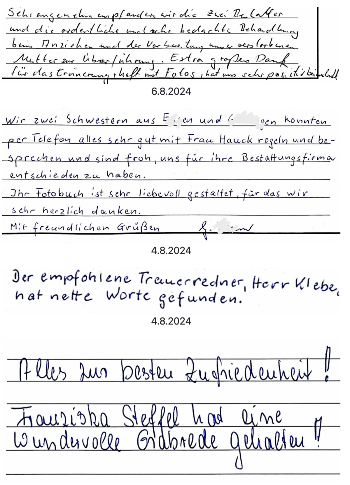 "Sehr angenehm empfanden wir die zwei Bestatter und die ordentliche und sehr bedachte Behandlung beim Anziehen und der Vorbereitung unserer verstorbenen Mutter zur Überführung. Extra großen Dank für das Erinnerungsheft mit Fotos, es hat uns sehr positiv berührt."