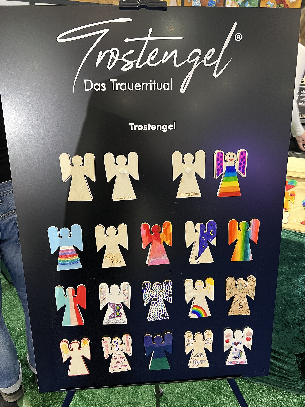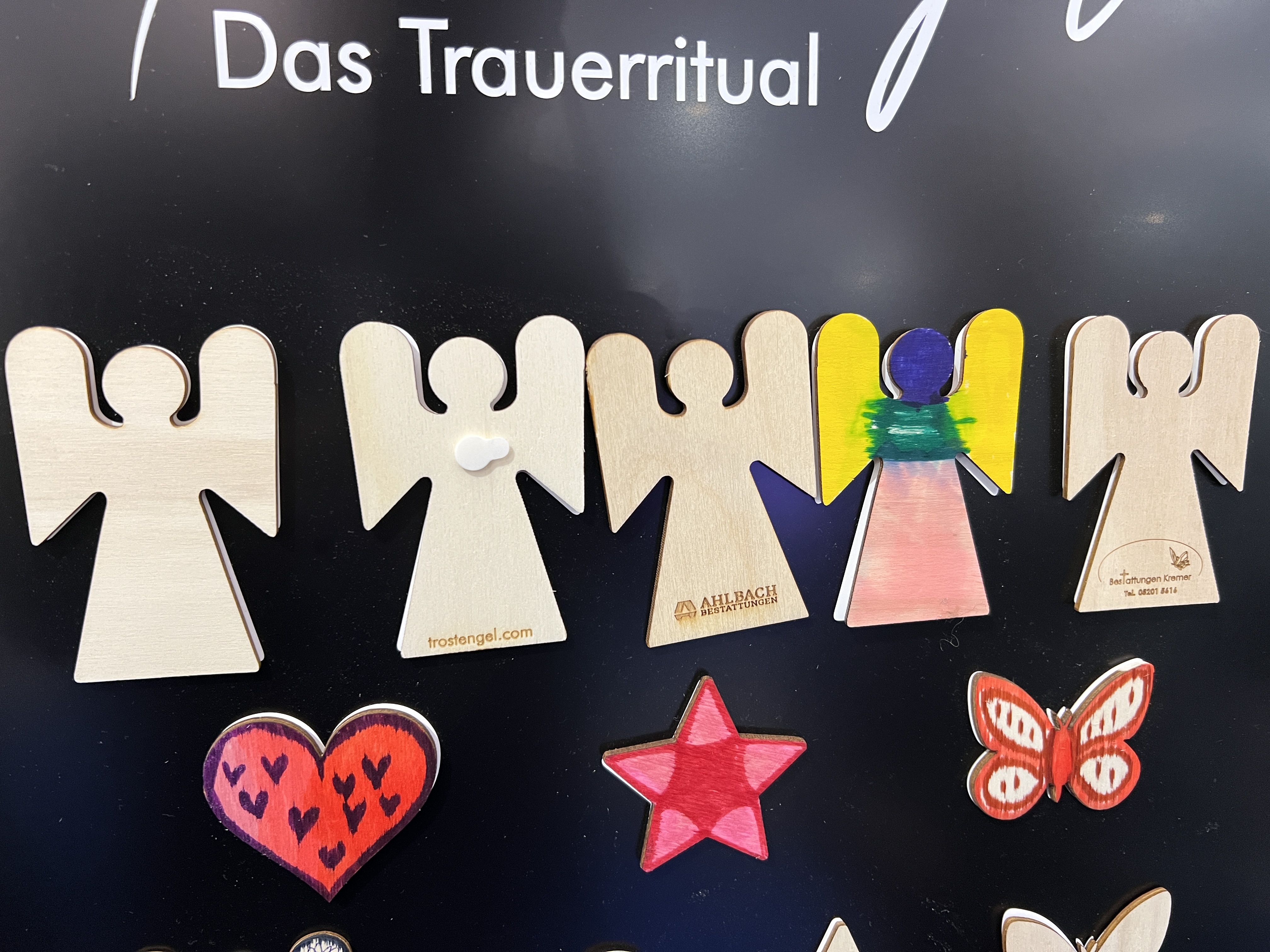 Zu Beginn einer Abschiedszeremonie entdecken die Teilnehmer einen kleinen holzgeschnitzten Engel zusammen mit einem Stifteset auf ihren Sitzplätzen. Während der Veranstaltung haben sie die Möglichkeit, diesen Engel mit einer letzten Botschaft oder einem Wunsch für den Verstorbenen zu versehen.