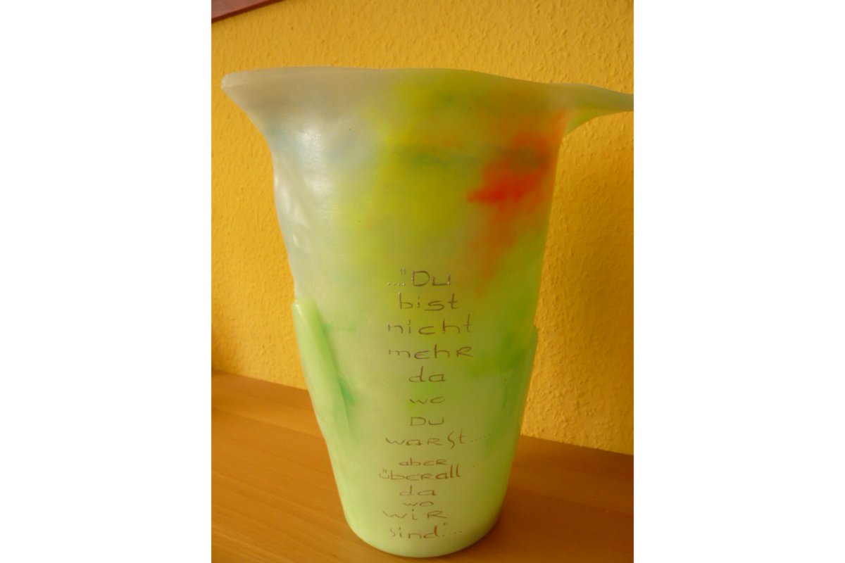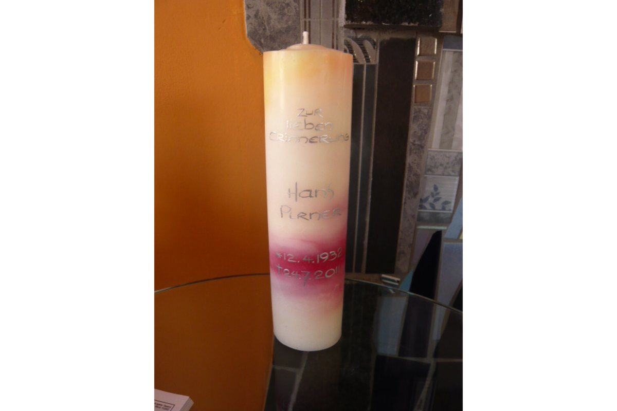 Erinnerungskerzen werden für jeden Verstorbenen individuell angefertigt. Keine Kerze gleicht der anderen. In der Regel wird die Kerze schon zur Aussegnung aufgestellt und bleibt bis zur Beisetzung beim Verstorbenen. Danach wird sie den Angehörigen übergeben.