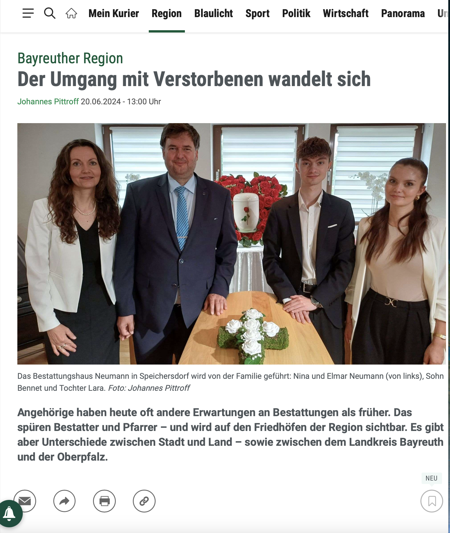 Der Text beschreibt den Wandel im Umgang mit Verstorbenen, insbesondere im Bestattungshaus Neumann in Speichersdorf. Seit der Gründung 1993 hat sich das Verhältnis von Erd- zu Feuerbestattungen stark verändert: Heute wählen 80 % der Kunden die Feuerbestattung. In katholischen Gebieten sind Erdbestattungen häufiger, da die Kirche bis Mitte der 1960er Jahre nur diese erlaubte.